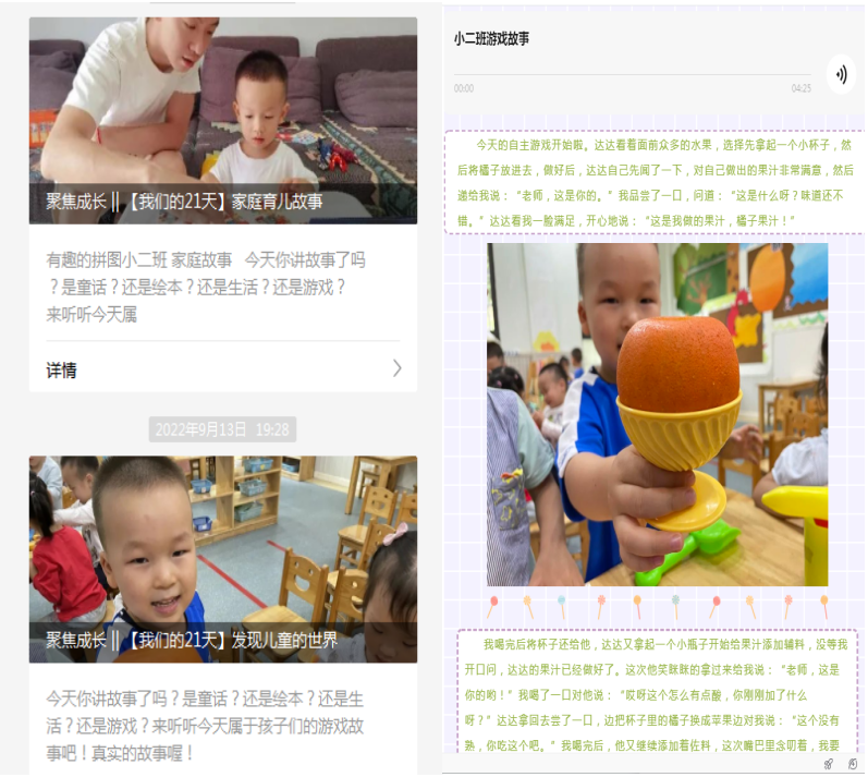 《我们的21天》栏目,用老师、家长的视角记录幼儿21天的成长,通过发现儿童的世界、家庭育儿故事两个板块来呈现幼儿在游戏中的成长、教师在游戏中的观察与分析、家长在亲子陪伴中的育儿理念提升。