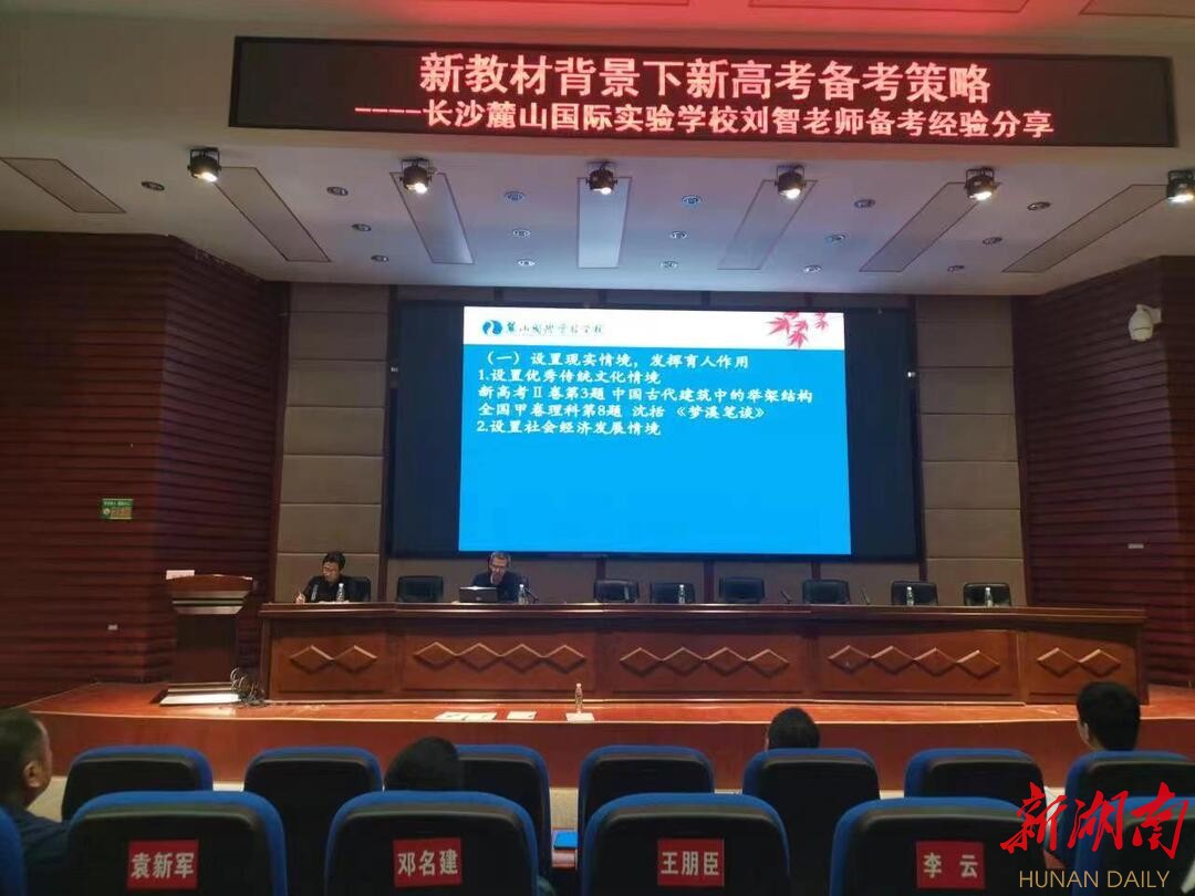 在会议室,一场围绕“新课标、新教材、新高考”的教学经验分享同时进行。长沙麓山国际实验学校高三思政课教研组组长吴美文以“加强三新研究,真正减负增效”为主题,科学分析了思政课在新高考中的地位,如何把握新教材和新课标,怎样在教学中真正做到减负增效,其实用性和可操作性都很强。