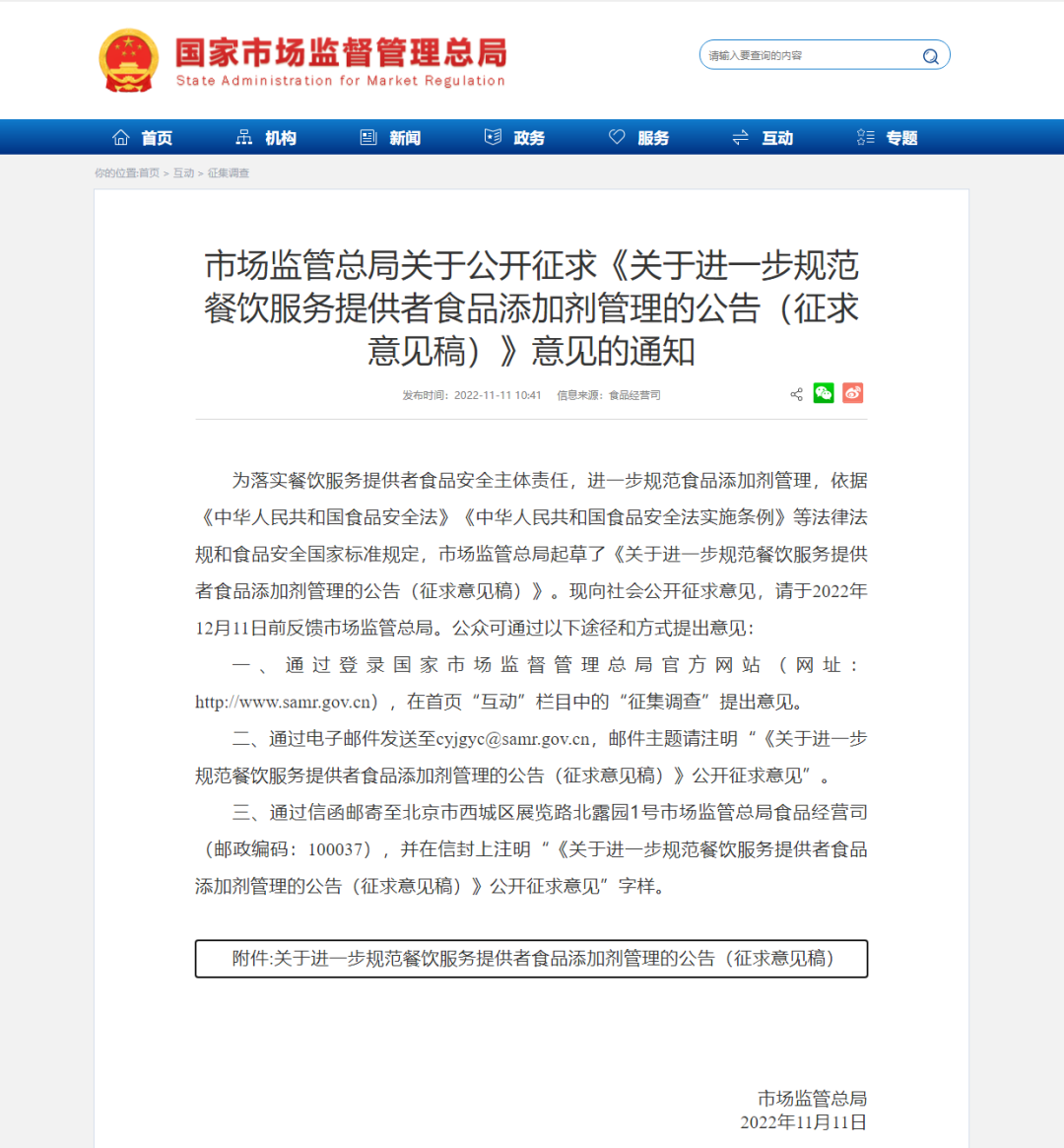 关于进一步规范餐饮服务提供者食品添加剂管理的公告(征求意见稿)