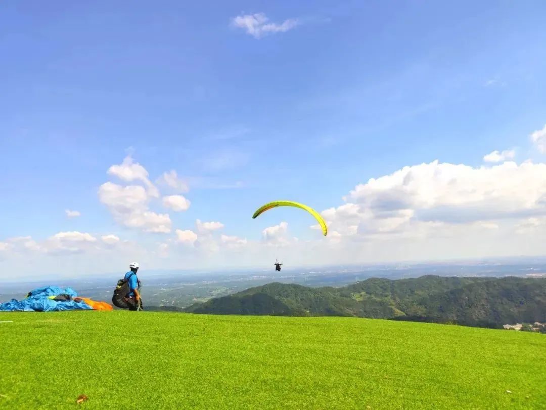 在黑麋峰滑翔伞基地,奔跑助力、双脚缓缓离开地面,你可以飞上天空感受秋风的凉爽,体验一场紧张又刺激的高空飞行之旅。