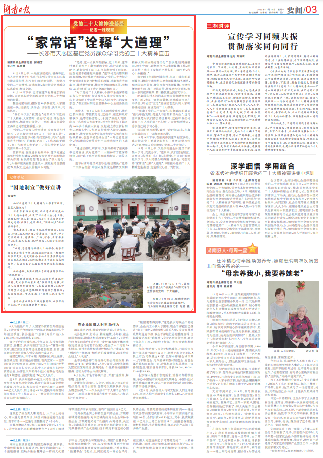 距离莲华村不远的高云社区黄家塘组两型文化广场,也是一派热闹景象。党员群众围坐在亭子里,听社区“五老”宣讲团老党员用大家听得懂的话语,宣讲党的二十大报告。