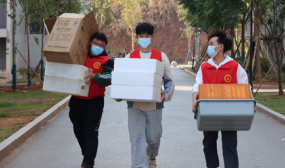 12时,学院老师和志愿者们手脚利落地打餐、装盒、打包、运输、配送。为提升送餐效率,师生们合力用建材木板临时打造几台小推车。“8000多份盒饭,送到同学们手中都还是热乎的,不禁为大家的机智点赞。”志愿者22级养生6班谢庆林带图分享道。