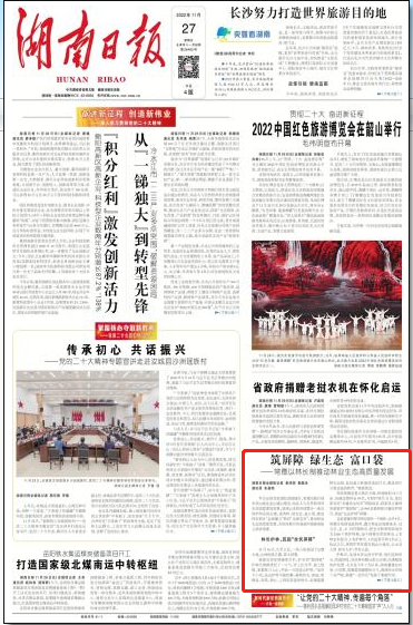 常德市林业局局长袁文介绍,目前常德森林覆盖率为48.01%,森林蓄积量为4363万立方米。今年完成植树造林17.97万亩,封山育林8.7万亩,退化林修复10.2万亩,森林抚育12.89万亩,完成省级生态廊道建设任务1920亩。