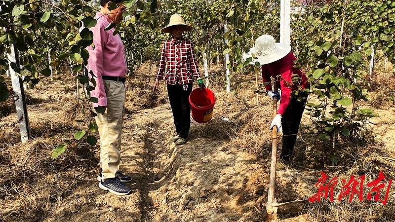 11月16日,在鼎城区蔡家岗镇泉垱村百亩猕猴桃基地,果农龚赛华正在为猕猴桃埋施冬肥。“磷肥壮根,有机肥可改善土壤,促进猕猴桃生长。”常德市老科协工作者覃建忠一边手把手指导,一边介绍冬肥的作用。