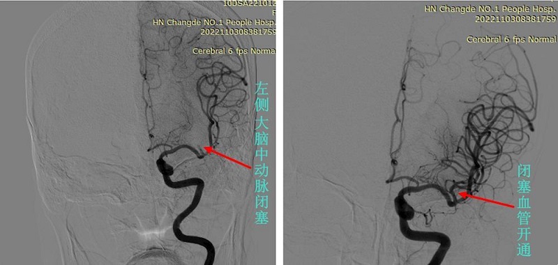 (图左:11月3日,术中脑血管造影显示,静脉溶栓治疗后,张奶奶的左侧大脑中动脉仍然闭塞。图右:左侧大脑中动脉取栓术后,闭塞血管开通)