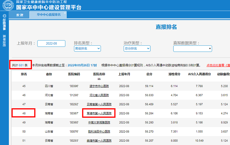 常德一医神经内科与神经外科均为湖南省省级临床重点专科,医院自2010年起开始建设卒中中心,2012年获批成为国家脑卒中筛查与防治基地,2016年获批成为国家卒中中心建设单位,2019年获批成为国家高级卒中中心。近年来通过不断提升诊疗技术,加强多学科协作,优化救治流程,畅通绿色通道,常德一医国家高级卒中中心高效运行,成绩突出。日前,国家卫生健康委脑防委办公室公布了2022年8月全国681家卒中中心综合排名,常德一医国家高级卒中中心获佳绩,综合排名位列全国第48名,在湖南省22家卒中中心中排名第二。