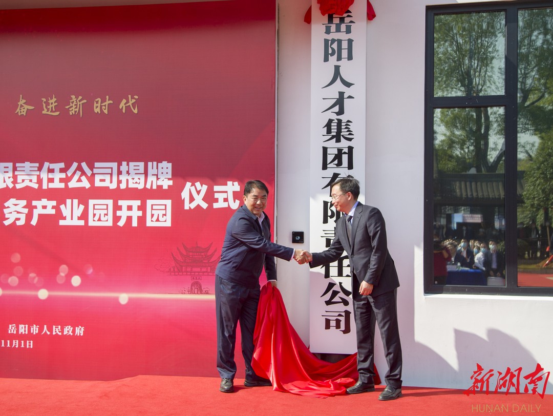 湖南日报·新湖南客户端11月1日讯(记者 徐典波 通讯员 何龙)今天,是岳阳市第二个“人才日”,岳阳人才集团揭牌、岳阳人力资源服务产业园同步开园。岳阳市委书记曹普华,市委副书记、市长李挚,与省人社厅党组成员、副厅长阳望平,省委组织部人才发展中心主任王斌初,共同为人才集团、产业园揭牌揭幕,并种植“人才树”。