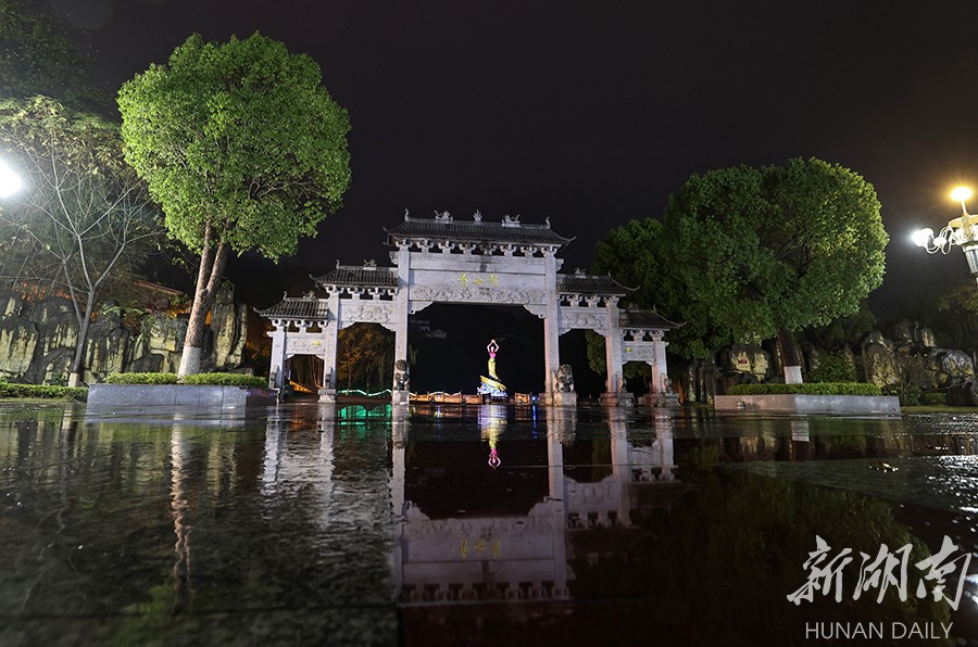 11月16日,雨夜中的郴州市龙女景区。景区因是《龙女牧羊》《柳毅传书》等民间故事的发源地而得名。相传,唐代儒生柳毅赶考途中,巧遇万家儿媳、洞庭龙王之女备受欺凌,牧羊于荒野,龙女托柳毅传书于龙王,龙女得救。后龙女与柳毅结为夫妇,孝亲敬老,佳话世代相传。湖南日报全媒体记者 张京明 摄