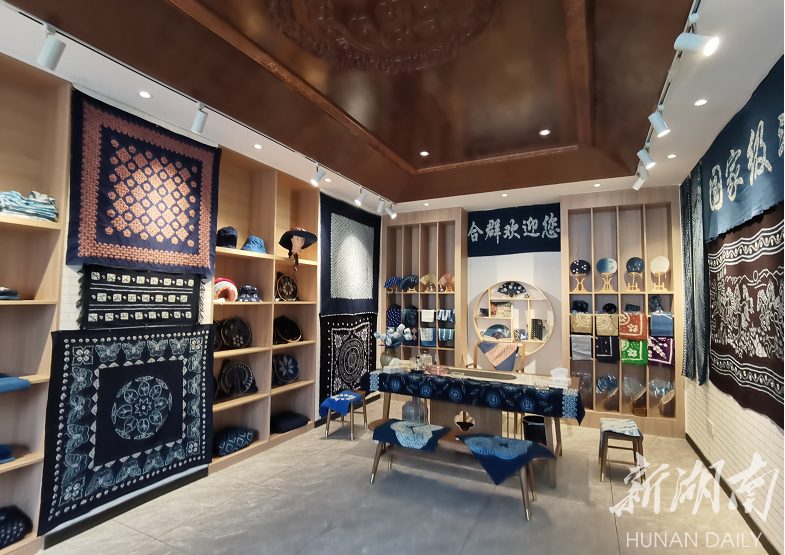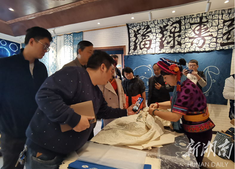 “板蓝根做染料,全手工扎染。”“这件作品有20多年的历史。”……11月14日,在合群村村部的白族扎染展厅内,“村民”张丕和正耐心地为参观者讲解中国非物质文化遗产白族扎染,以及部分作品背后的故事。