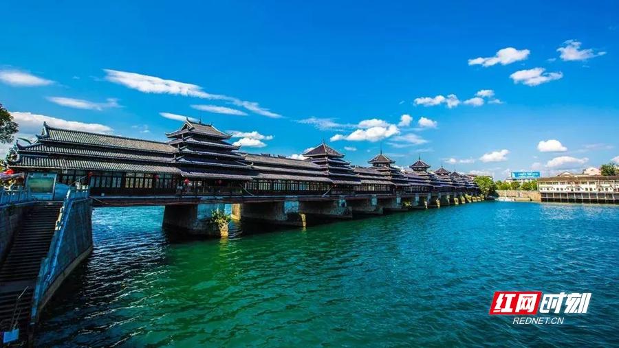 你瞧,蔚蓝舞水河上,246.7米长的龙津风雨桥,形“若晴虹将饮,似游龙浮水”,横贯两岸,气势宏大。深蓝色的琉璃瓦、6组金黄色的双龙抢宝和兽头和飞檐翘角等,处处展现着历史古迹和侗族建筑装饰艺术的完美融合。