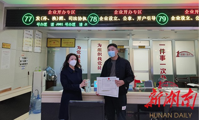近期,怀化市市场监管局登记注册工作服务不间断,因为疫情,该局工作人员居家办公,线上指导申请人通过“一网通办”平台填写公司设立登记申请资料。11月7日,是市政务服务中心解封开放的第一天,市市场监管局工作人员立即审核通过了上述公司申请资料,并将营业执照和免费印章交付到申请人手中。