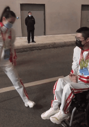单腿蹲下为轮椅上的队友系鞋带