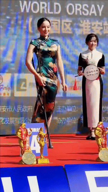 她身穿绿色旗袍参加健美比赛的照片