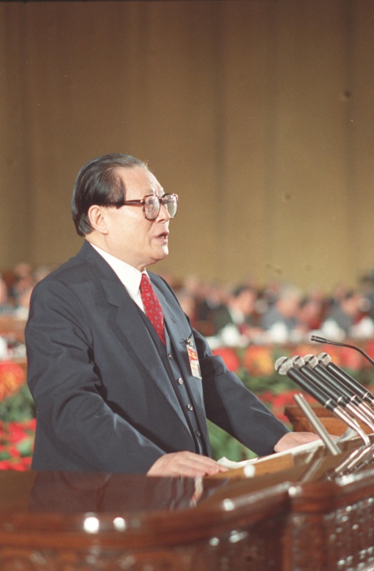 1997年9月12日,中国共产党第十五次全国代表大会在北京人民大会堂开幕。这是江泽民同志代表第十四届中央委员会作报告。新华社发