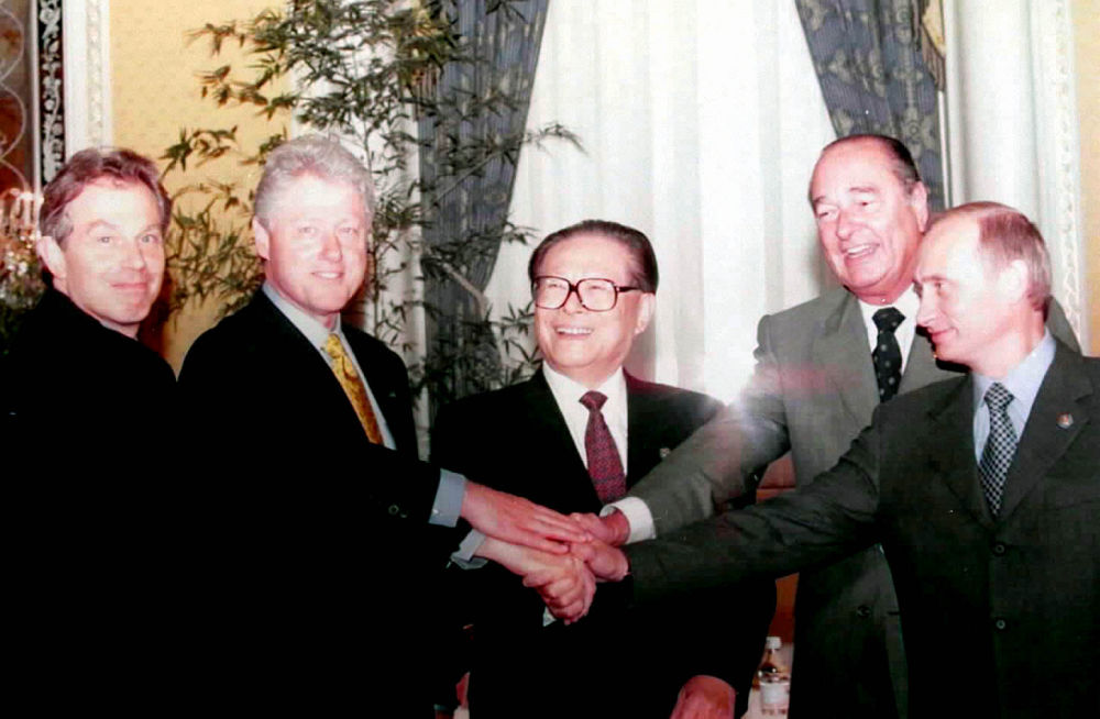 2000年9月7日,由中国倡议的联合国安理会五个常任理事国首脑会议在纽约举行。江泽民同志(中)同法国总统希拉克(右二)、俄罗斯总统普京(右一)、英国首相布莱尔(左一)、美国总统克林顿(左二)握手合影。新华社发