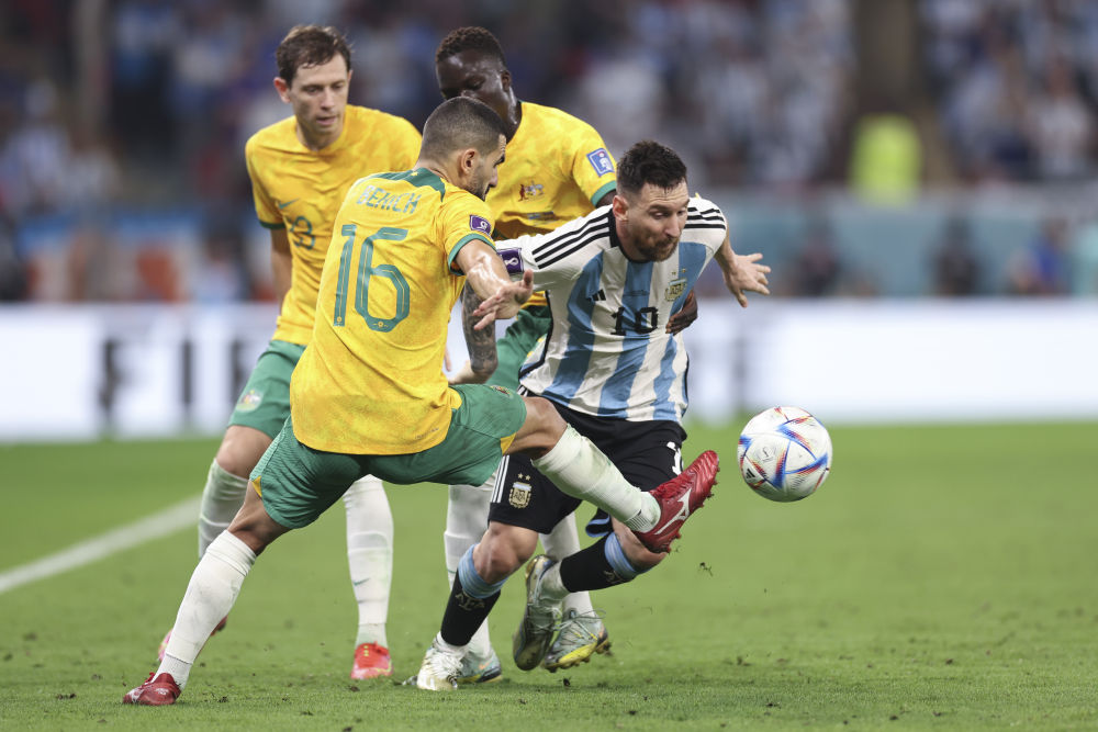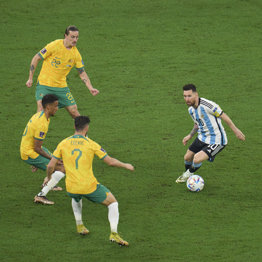 ↑澳大利亚队球员阿·贝希奇(前左)在比赛中防守阿根廷队球员梅西。新华社记者 徐子鉴 摄