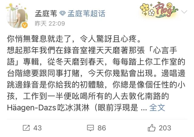 12月4日晚,孟庭苇发长文回忆与陈扬录制《心言手语》专辑时的点滴,“所有认识你的人不会忘记你,也将永远爱你。”