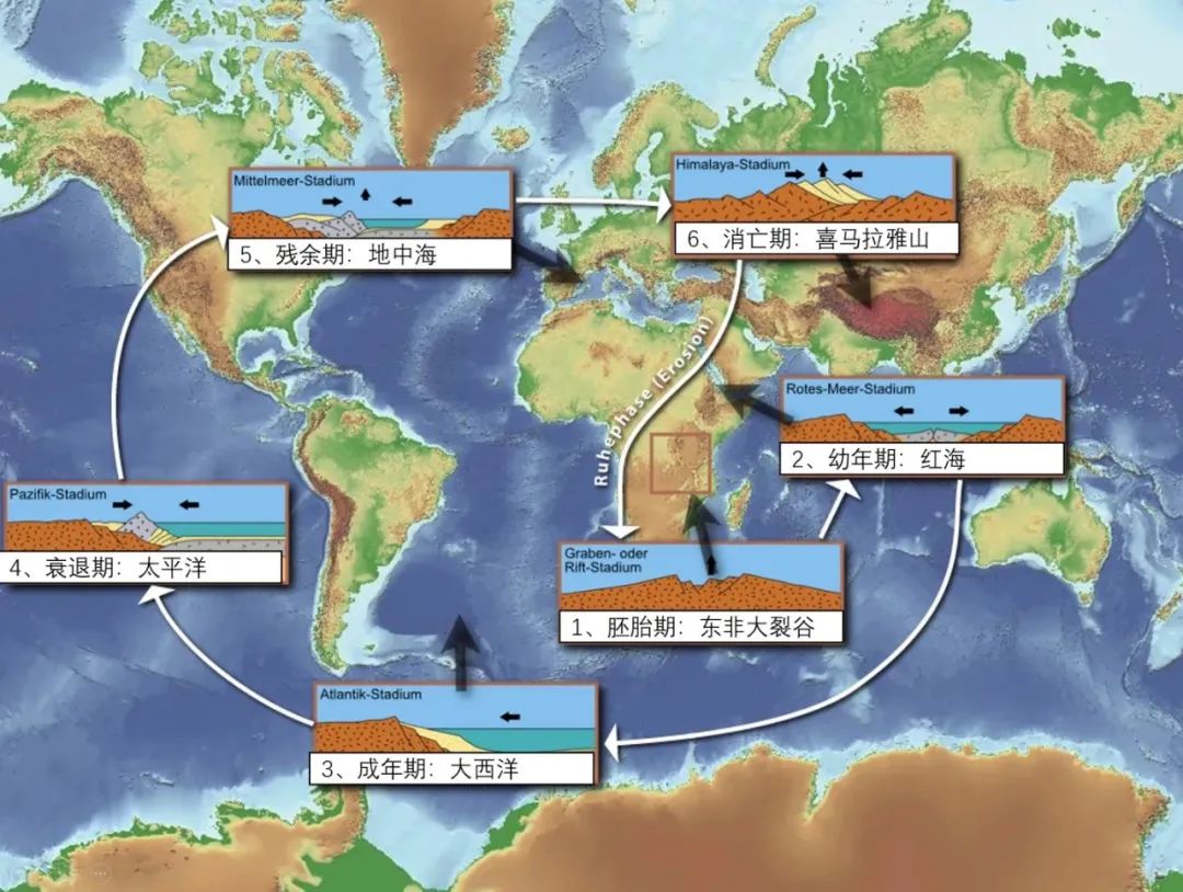 地幔中的热循环模式,有人认为是全幔循环,有人认为是上下地幔分别循环。图片来源:wikipedia而地壳部分相对于地幔和地核非常薄,地壳平均厚度只有17千米(大陆地壳 33 千米,海洋地壳 10 千米),就算加上上地幔顶部部分固态岩石后组成的岩石圈,其厚度也只有 100 千米左右。与之相比,地幔厚度则高达 2850 千米,因此,在地幔运动的带动下,这些薄薄的固态岩层必然会被撕裂开来,并随着地幔而运动——就好像火锅上的白菜帮子会因为火锅汤底的翻腾而运动不休一样。被撕裂的地壳的各个部分就变成了板块,而随着地壳的运动,板块之间也会运动起来,有些板块之间相互碰撞,有些板块之间相互分离。从常识就能知道,这些相互分离的板块边界处又薄又脆弱,其下的地幔物质也很容易突破岩层的封锁,喷出地表——而随着板块之间分开的越来越远,板块边界处火山喷发后的岩浆冷却,就形成了薄薄的地层,也就是洋壳。由于这里相对于板块内部地层薄很多,因此自然就是低洼地带,所以就会积水形成海洋。事实上海洋也就是这么形成的,而海洋的形成也与板块运动息息相关。裂谷-小洋盆-成熟的洋盆-消亡阶段的洋盆-死亡即将闭合的洋盆-完全闭合的洋盆。这在地质学中被称为威尔逊循环。