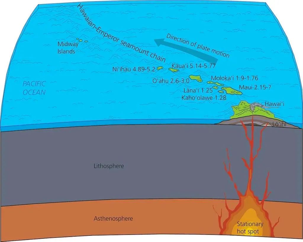 在这个理论中,地幔热柱的位置是不变的,但是由于地壳运动(图中深蓝色箭头),地幔热柱就在地壳上形成一系列火山。图中的数字是岛屿的形成年代,单位为百万年,比如4.89,就是489万年。图片来源:getarchive.net