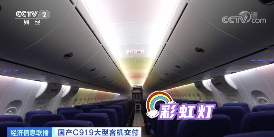 C919客舱内部照明非常有特点,配备了LED照明和情景照明,整个客舱照明有10种情景模式。