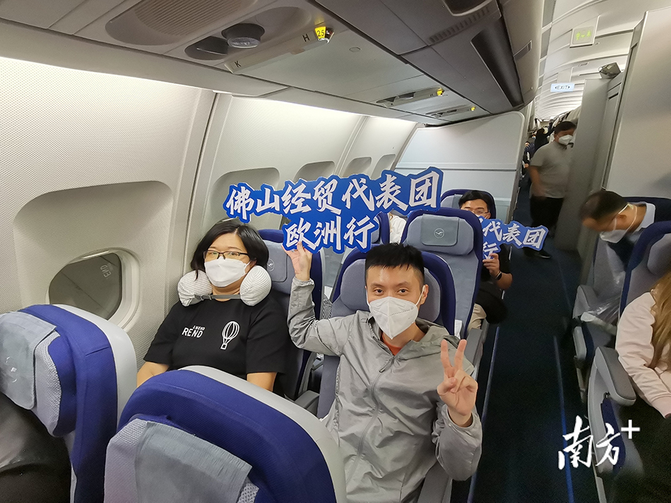 11月23日夜晚,佛山市经贸代表团登上前往法兰克福的航班。南方网 图(南图佛山市电子信息行业协会供图)