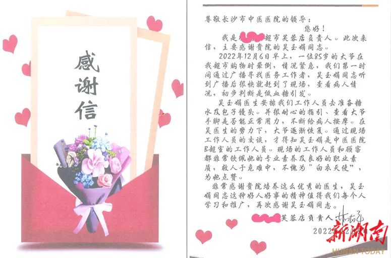 大众卫生报·新湖南客户端12月12日讯(通讯员 粟青梅)12月11日,长沙市中医医院(长沙市第八医院)总值班、办公室副主任吉美凤收到一封感谢信,这是某超市负责人送来的,讲述了该院医生、中共党员吴玉娟巧施援手救助在店内晕倒的8旬老人的故事。