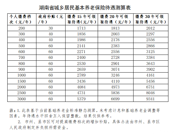 目前,湖南省城乡居民基本养老保险普通参保人缴费有200—3000元13个缴费档次,对重度残疾人、低保对象、特困人员等特殊困难群体,保留每人每年100元的缴费档次。参保人自主选择缴费档次,多缴多得,多缴多补贴,长缴多得。