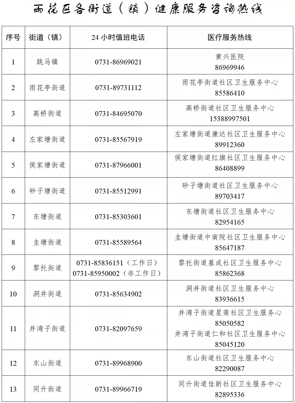 近日,长沙市各区县相继公布了医院发热门诊电话和社区卫生服务中心热线,供市民朋友咨询新冠感染症状、用药治疗等方面的信息,具体名单如下:
