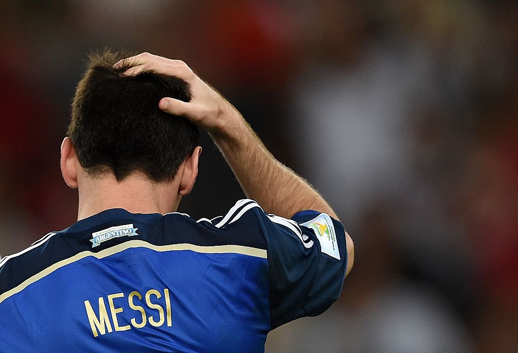 2014年德国世界杯,阿根廷亚军,梅西凝视擦肩而过的大力神杯。(下图)
