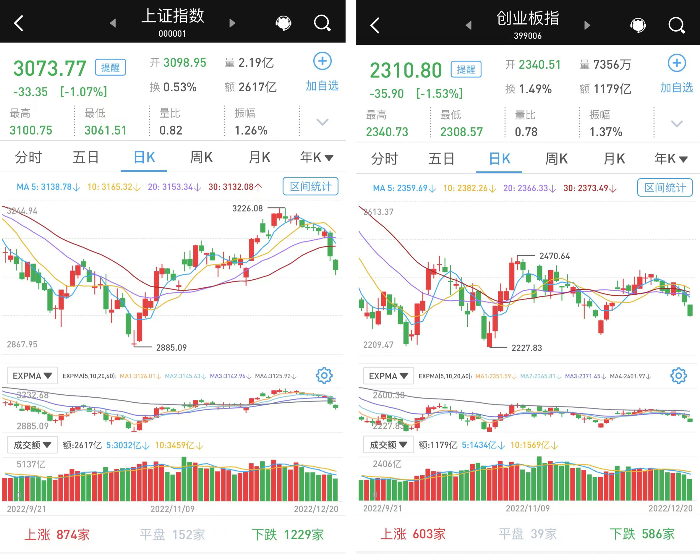 至12月20日收盘,上证综指跌1.07%,报3073.77点;科创50指数跌0.36%,报952.77点;深证成指跌1.58%,报10949.12点;创业板指跌1.53%,报2310.8点。