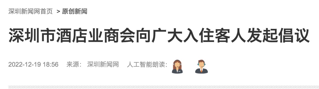 此外,12月19日,广东深圳市酒店业商会呼吁,阳性入住客人请充分相信自己所入住的酒店能够提供温暖的服务。酒店将设立专属楼层,用科学的防疫方法全力负责酒店的消毒和卫生工作;酒店会为客人提供在住期间的物品配送和送餐等服务;酒店客人入住期间房间将不做每日清洁。