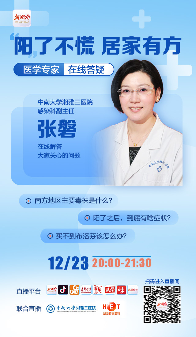 湖南日报12月23日讯(全媒体记者 王铭俊 通讯员 李姗)“感染新冠病毒的临床表现有哪些?”“买不到布洛芬怎么办?有何平替产品?”“临床症状缓解后,何时恢复工作?”12月23日晚8时,中南大学湘雅三医院感染科副主任,教研室副主任张磐将做客湖南日报·新湖南客户端“‘阳’了不慌,居家有方”直播间,为大家在线答疑。