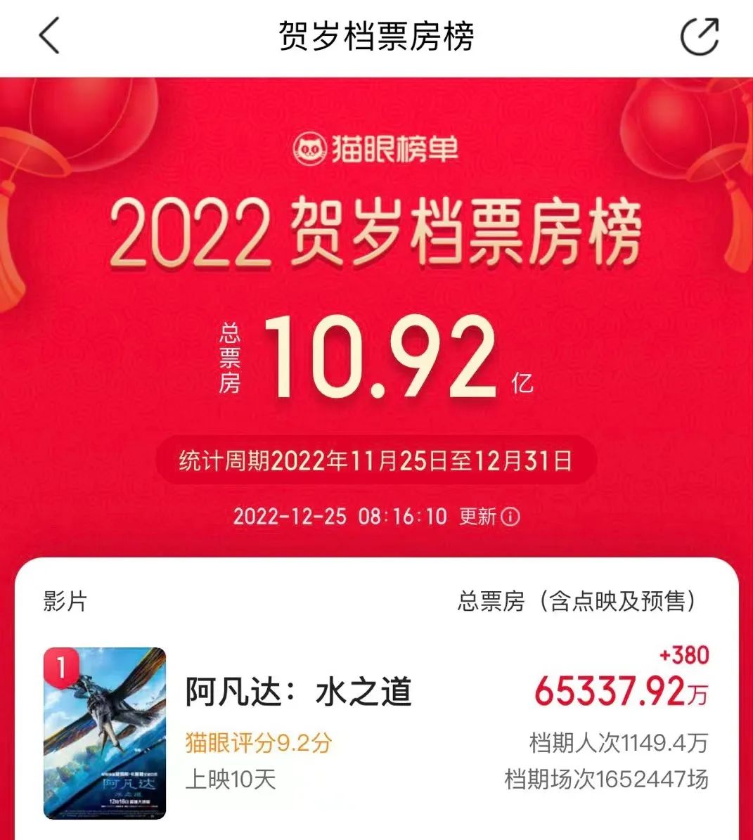 (原题为:2022贺岁档票房破10亿元!来看看《阿凡达:水之道》贡献了多少)