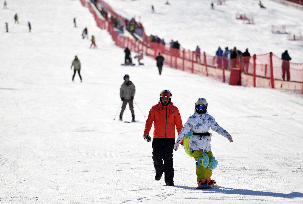 ↑ 市民在北京渔阳国际滑雪场滑雪。