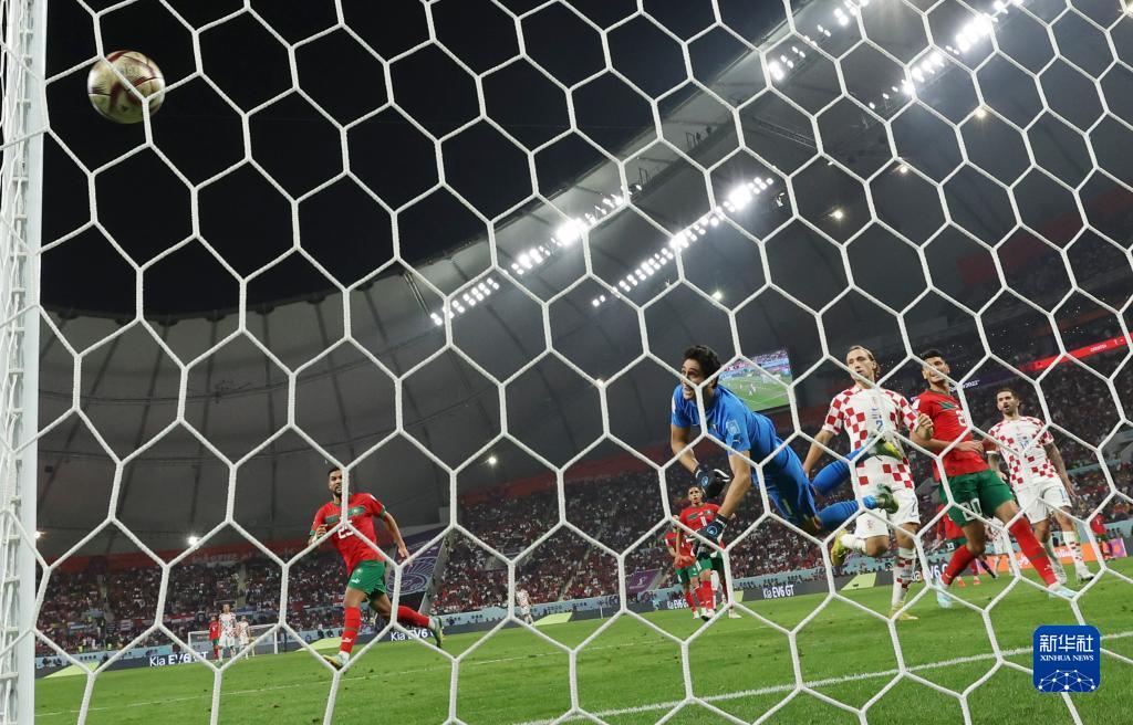 12月17日,摩洛哥队守门员布努(右四)未能扑出克罗地亚队球员奥尔西奇的射门。新华社记者 贾浩成 摄