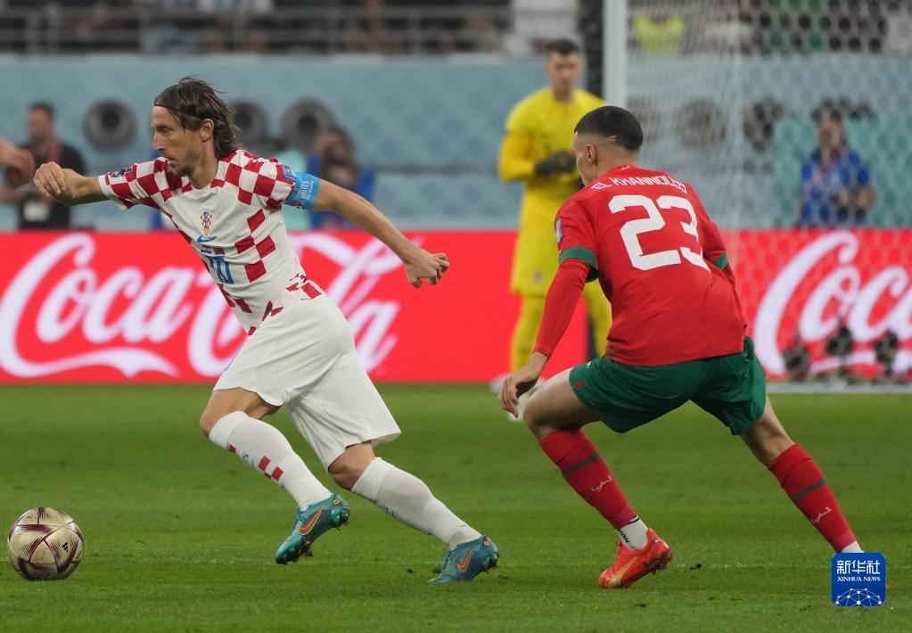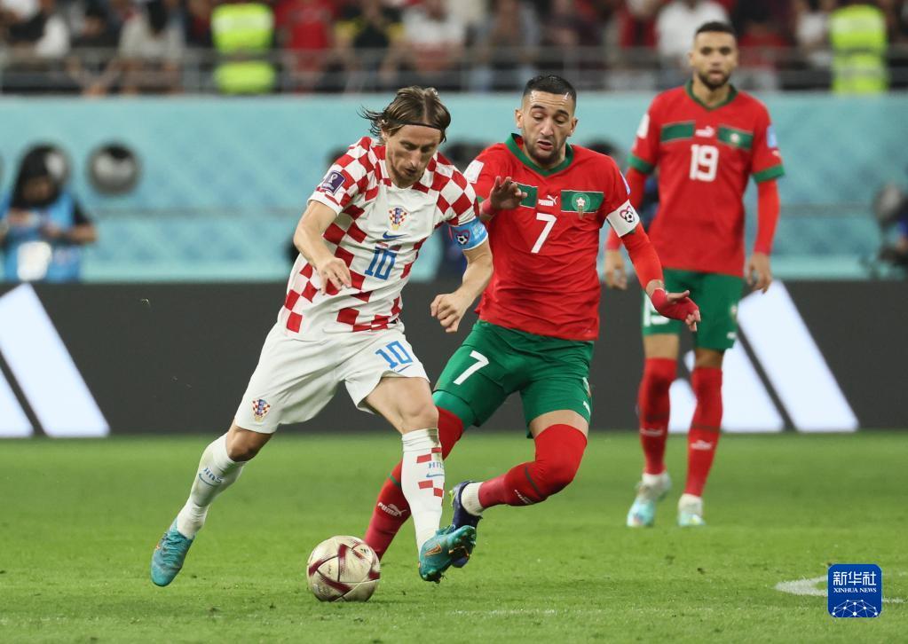 12月17日,克罗地亚队球员莫德里奇(左)在比赛中突破摩洛哥队球员齐耶赫的防守。新华社记者 兰红光 摄
