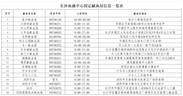 据了解,长沙血液中心固定献血屋现均可提供献血服务,其中星沙献血屋、友阿献血屋、五一献血屋、南门口献血屋、德思勤献血屋工作时间持续至晚上8时。