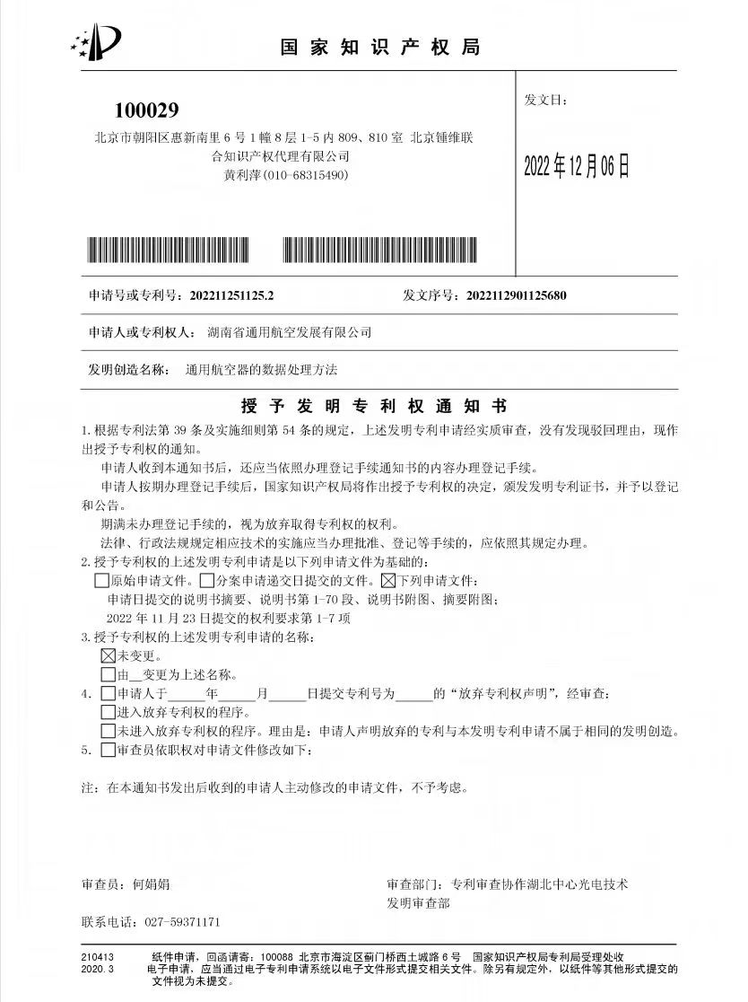 新湖南客户端12月7日讯(通讯员 杨璐璐 于佳乐)12月6日,湖南省通航发展公司自主研发的《通用航空器的数据处理方法》获得国家知识产权局授予发明专利权通知书,据了解,这是该公司首次获得国家发明专利授权,实现了公司乃至湖南机场集团发明专利授权从“0”到“1”的突破。