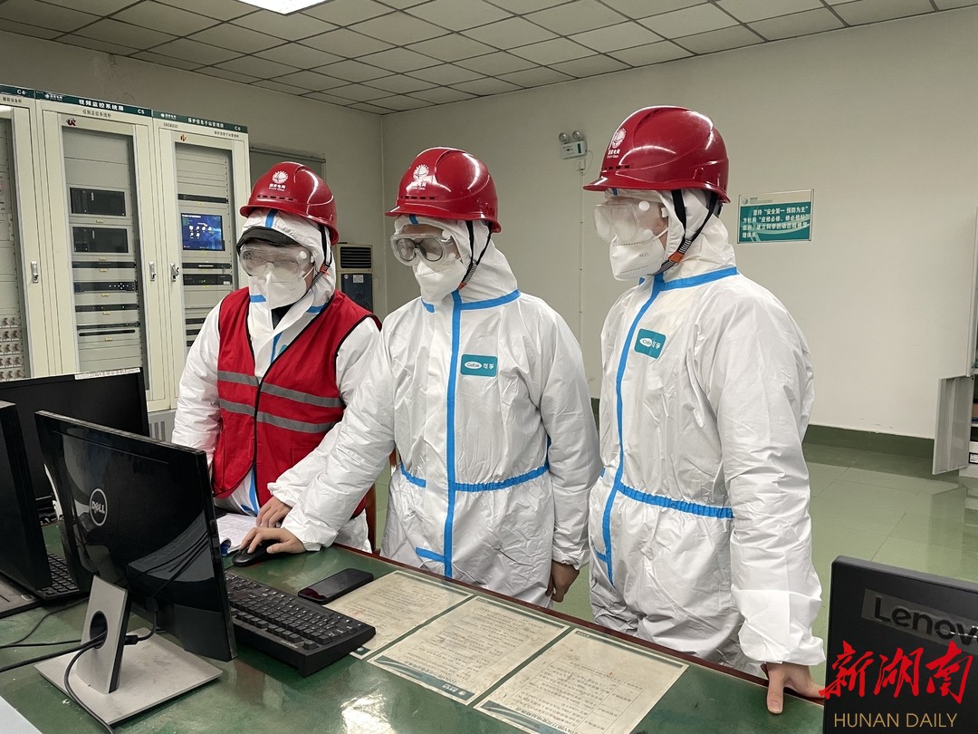 (电力工作人员正身穿防护服开展投产送电工作。詹佳宇 摄)