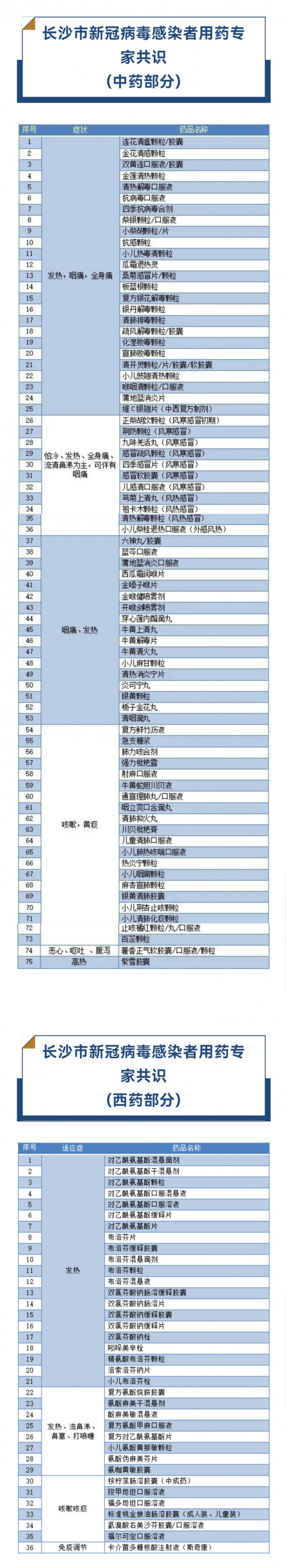 长沙市新型冠状病毒肺炎防控指挥部办公室参照国家、其他省市制定的《新冠病毒感染者用药目录》,结合本市群众用药习惯,形成了《长沙市新冠病毒感染者用药专家共识》,并推荐给社会公众。