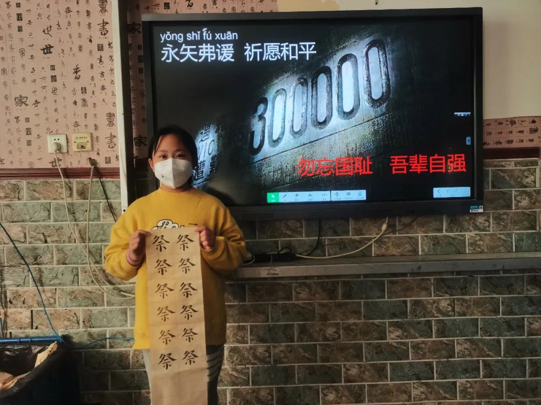 在德润园小学,全校师生一起收看公祭日直播活动,在书法课上学习“祭”字书写。老师们借一个汉字的历史渊源,以笔传情,悼念南京大屠杀死难者,教育孩子们铭记历史史实,增强爱国情感,珍爱和平生活。孩子将这个大大的汉字写在宣纸上,记在心底,表达了对南京大屠杀中死难同胞的默哀!