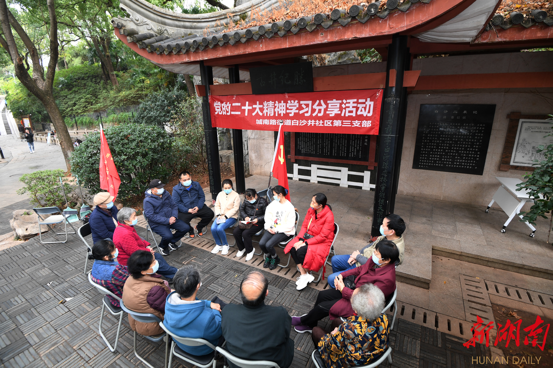 近日,白沙古井旁,长沙市天心区城南路街道白沙井社区第三支部以“流动党课”的形式,开展党的二十大精神学习分享活动,倡导清清白白做人、坦坦荡荡做事。