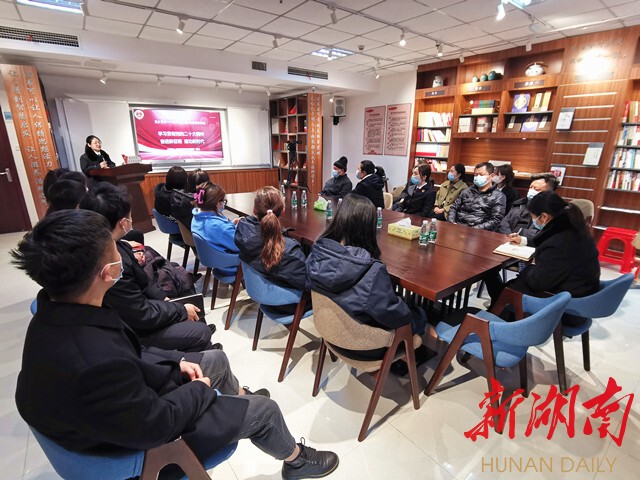 台上,来自湘潭县人民检察院的90后“里手”康珉,以《学习贯彻党的二十大精神 奋进新征程 建功新时代》为主题,从“读原文,学习党的二十大报告中10组关键词”“干实事,践行新时代新征程的使命担当”两个方面,就如何学习贯彻落实党的二十大精神,与台下40余名政法干警、基层检察官代表,以及社区居民代表进行交流分享。