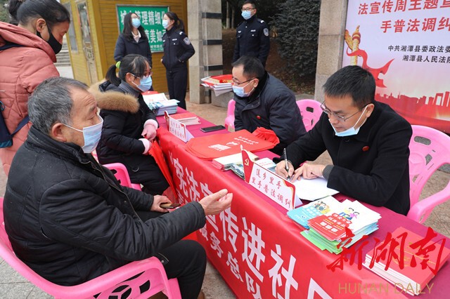 湘潭县莲花广场,拉横幅、摆展板、发资料……县人民法院和易俗河镇的志愿者忙个不停。由该县新时代文明实践中心、县委政法委、县委宣传部牵头组织的“莲乡里手——里手普法调纠”系列志愿服务活动正在此举行。
