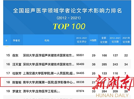 湖南日报·新湖南客户端12月6日讯(通讯员 曾韵)12月5日,“全球学者库”发布“2012-2021年全国超声医学领域学者论文学术影响力排名”,南华大学附属第一医院高层次引进人才、医学影像中心学科带头人陈智毅教授排名第18位,是湖南省唯一且连续两年入选Top 20榜单的学者。