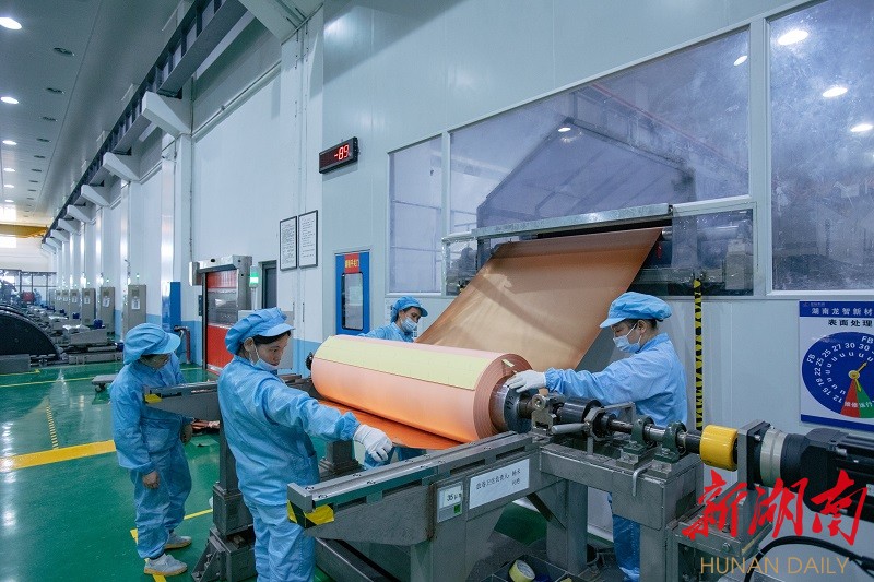 湖南龙智新材料科技有限公司生产车间,随着生箔机、表面处理机等设备运转,一卷卷电解铜箔缓缓下线。
