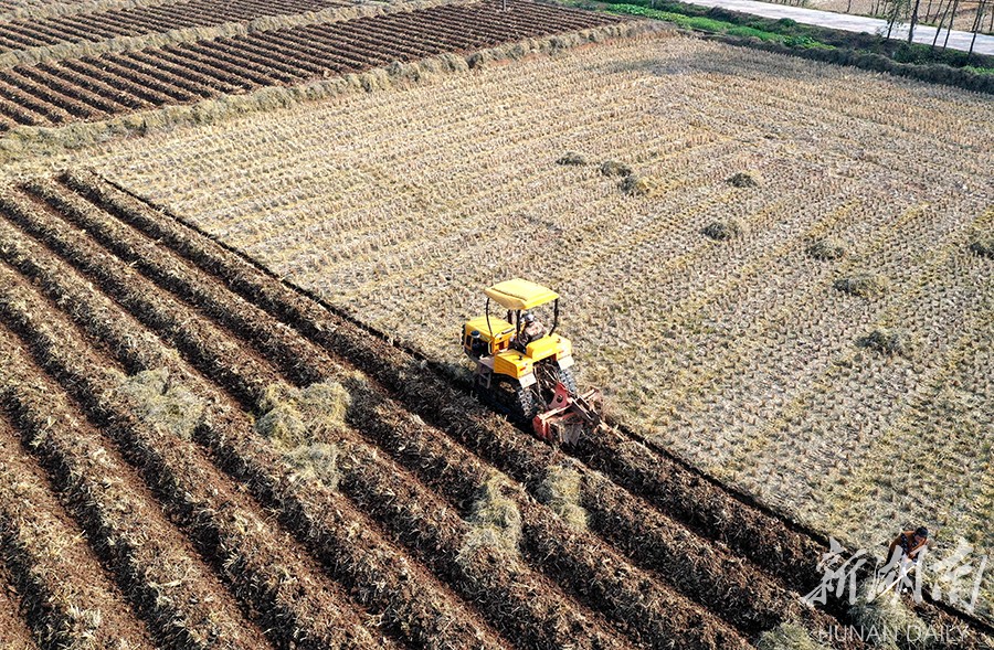 12月13日,宁远县冷水镇李铭远村,农机手驾驶拖拉机在田间起垄。近年,该县引导农民利用冬闲季节开展耕地治理,通过起垄晒垡、撒生石灰等措施,解决土壤酸化,减少病虫害发生,提升耕地地力。 乐水旺 摄