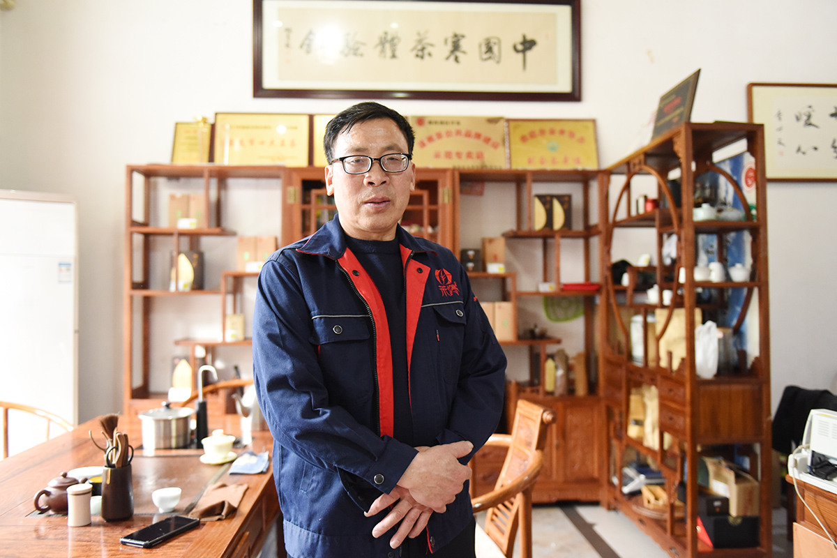 走进新化县天门香茶业,古朴装潢的室内飘荡着悠扬的音乐,老式的实木茶台旁,王在富身着蓝色工作服,鼻头上一副黑框眼镜。一片片茶叶经他冲泡,橙黄透亮的汤色悦人耳目,飘逸的兰香瞬间弥漫四周,入得口来馥郁芬芳、韵味甘甜。一说起茶,王在富的话匣子就收不住,从茶青采摘到萎凋、发酵、烘焙,到与茶结缘的故事,他操着一口浓重的新化口音,一一娓娓道来。