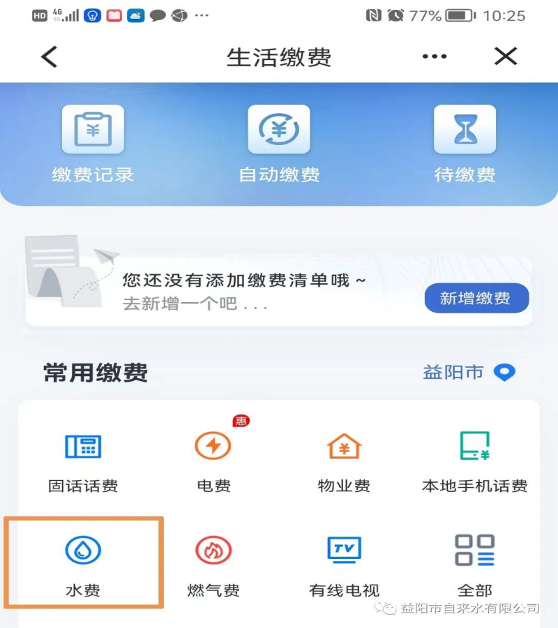 您可关注益阳市自来水有限公司微信公众号,通过掌上营业厅办理相关涉水业务。