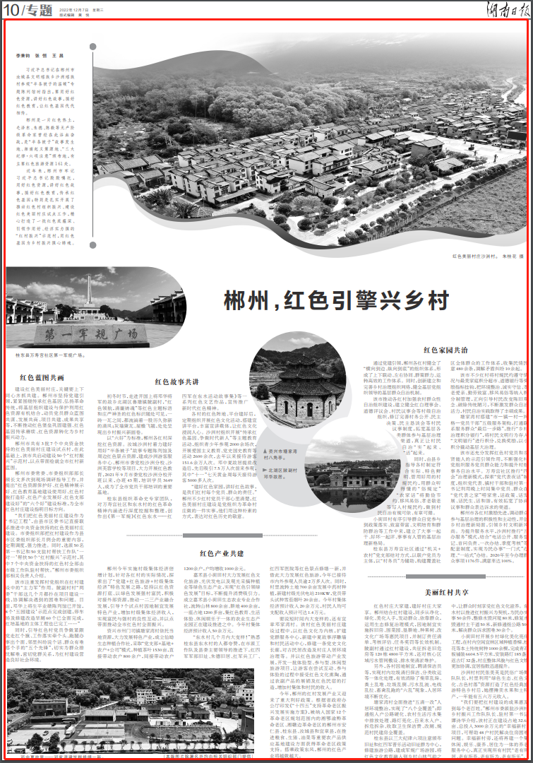 近年来,郴州市牢记习近平总书记殷殷嘱托,用好红色资源,讲好红色故事,搞好红色教育,传承红色基因;特别是扎实开展了推动红色村组织振兴、建设红色美丽村庄试点工作,精心打造了一批红色底蕴深、引领作用好、经济实力强的“红村振兴”示范村,用红色基因为乡村振兴强心铸魂。